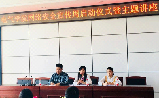 为增强学生网络安全意识,营造健康文明的网络环境,提升“互联网+”时代背景下学生工作教育、管理、服务水平,助力学校双一流建设和学生成长、成才,按照学校的统一安排,我院从9月17日起开展为期一周的网络安全宣传周教育活动。9月18日为教育主题日,电气与电子工程学院于中午12:30在新主楼G1012报告厅举办网络安全宣传周启动仪式暨主题讲座。参加本次活动的有:院党委副书记兼副院长李丽老师,团总支书记周广老师,网络文化工作室主任、电气研16-3班陈璐同学,大一、大二、大三、研一、研二各班宣传委员,各院级学生组织负责宣传和新媒体工作的同学,网络文化工作室全体成员。
