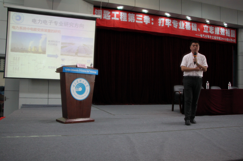 第四位主讲人是电力电子与电力传动系的吴晓刚教授。吴晓刚教授博士毕业之后一直从事电力电子行业的研究。作为土生土长的哈理工电气学子,看着又一批新生入学,吴晓刚教授深有感触,他感叹,“二十年前的我也像你们一样,怀揣梦想走进大学校园,二十年过去了,我见证了电气学院的发展!”说到此,同学们报以热烈的掌声。