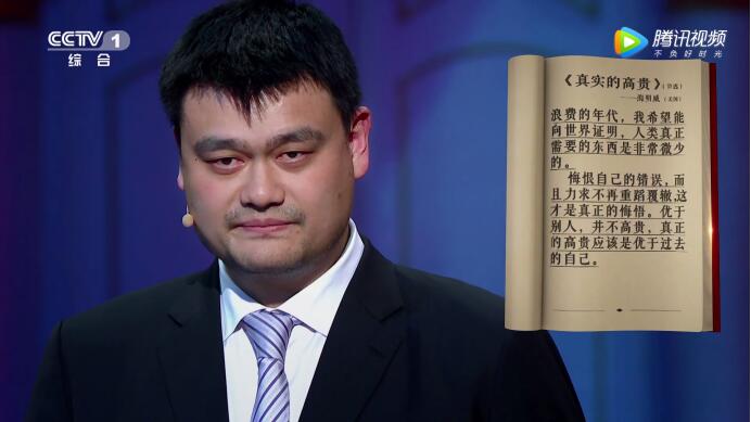 姚明笑着回忆有一年夏天,他听到了耳边传过的呼呼风声,球鞋在地板上的摩擦声,篮球进网筐刷网而过的声音,从此他爱上了篮球。他的初心是纠正自己过去的错误,正如他朗读的海明威的《真正的高贵》中:“优于别人,并不高贵,真正的高贵应该是优于过去的自己。”