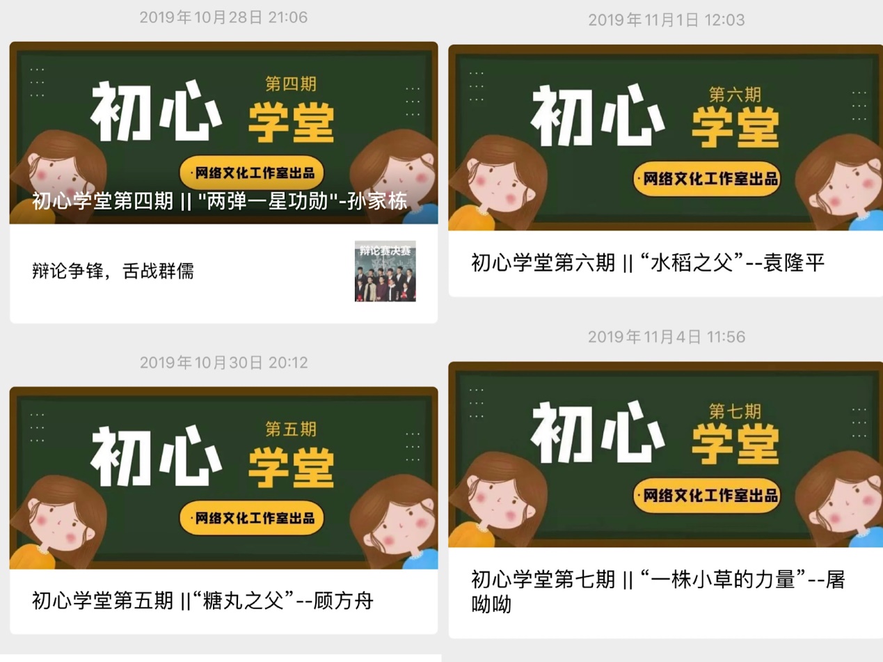 反响及效果:通过学生自主查找资料、汇总、撰稿,实现自我教育的目的。初心学堂系列总的阅读量达到3138,单篇最高阅读量达到334,二次转发达到101,在看数量达到74。