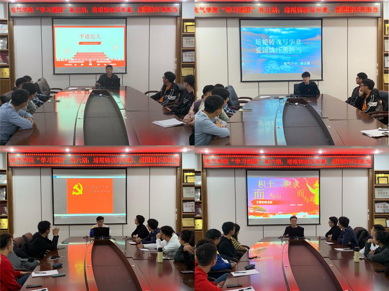4.在不忘初心主题教育期间,电气学院分党校组织学生党支部进行“学习强国”系列交流座谈会的开展,第五期、第六期座谈会以“培根铸魂写华章、爱国情怀勇担当”为主题,从习近平总书记的引经据典入手,通过党支部交流研讨后,4名党员参加座谈并通过PPT的形式对中华优秀传统文化进行交流。中华优秀传统文化是中华民族的根和魂,一个国家和民族如果丧失了根脉、丢掉了灵魂,就无法在世界上立足,更何谈成长与壮大。建立在中华优秀传统文化基础上的软实力,更具长久的影响力、感染力和穿透力。所以作为新时代的青年,更应该从点滴开始,把学习中华民族优秀传统文化,贯穿于学习生活的最深处,从根本上帮我们树立正确的世界观、人生观、价值观,指引学生成为更好的中国人。第七期、第八期座谈交流会以“讲好中国故事、传递青春能量”为主题,以作为新时代的青年人,应担负起祖国发展的历史重任为切入点,各支部党员深入交流研讨,通过开展“不忘初心、牢记使命”主题教育,就是要让大家对照党章时刻警醒自己,更加自觉的为新时代党的历史使命不懈奋斗,不忘祖国历史,作为青年党员,更应该了解中国好故事,让这些优秀的人物事迹植根在内心,中华优秀传统文化不但是中华民族的基因,更成为自己人生路上的启明灯,以习近平总书记为榜样,继承和发扬中华优秀传统文化,讲好中国故事,不断增强思想和精神的内核,坚定文化自信,积聚更基本、更深沉、更持久的力量。
