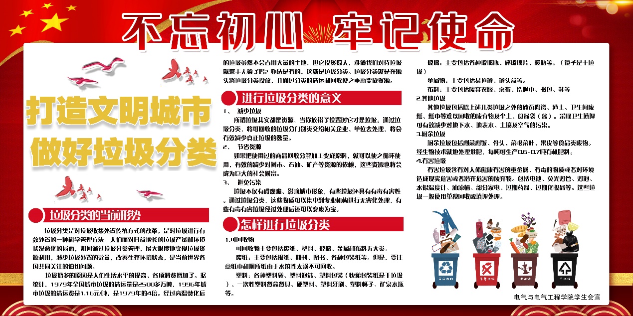 6.开展“垃圾分类”知识竞赛。为加深“不忘初心”主题教育的深度,共促文明城市创建,推进资源全面节约和循环利用,让我们的党员和团员肩负起建设祖国的重任,开展“垃圾分类”为主题的知识竞赛,各参赛队伍进行了“垃圾分类”的理论宣讲,阐述了自己对于“垃圾分类”的内涵理解。电气学院以“不忘初心、牢记使命”主题教育为契机,将“创设文明城市,做好垃圾分类”深刻落实,以实际行动践行使命与担当,通过自己的方式,将主题教育的成果转化为创设文明城市的动力,努力营造美好的城市态貌和校园生活