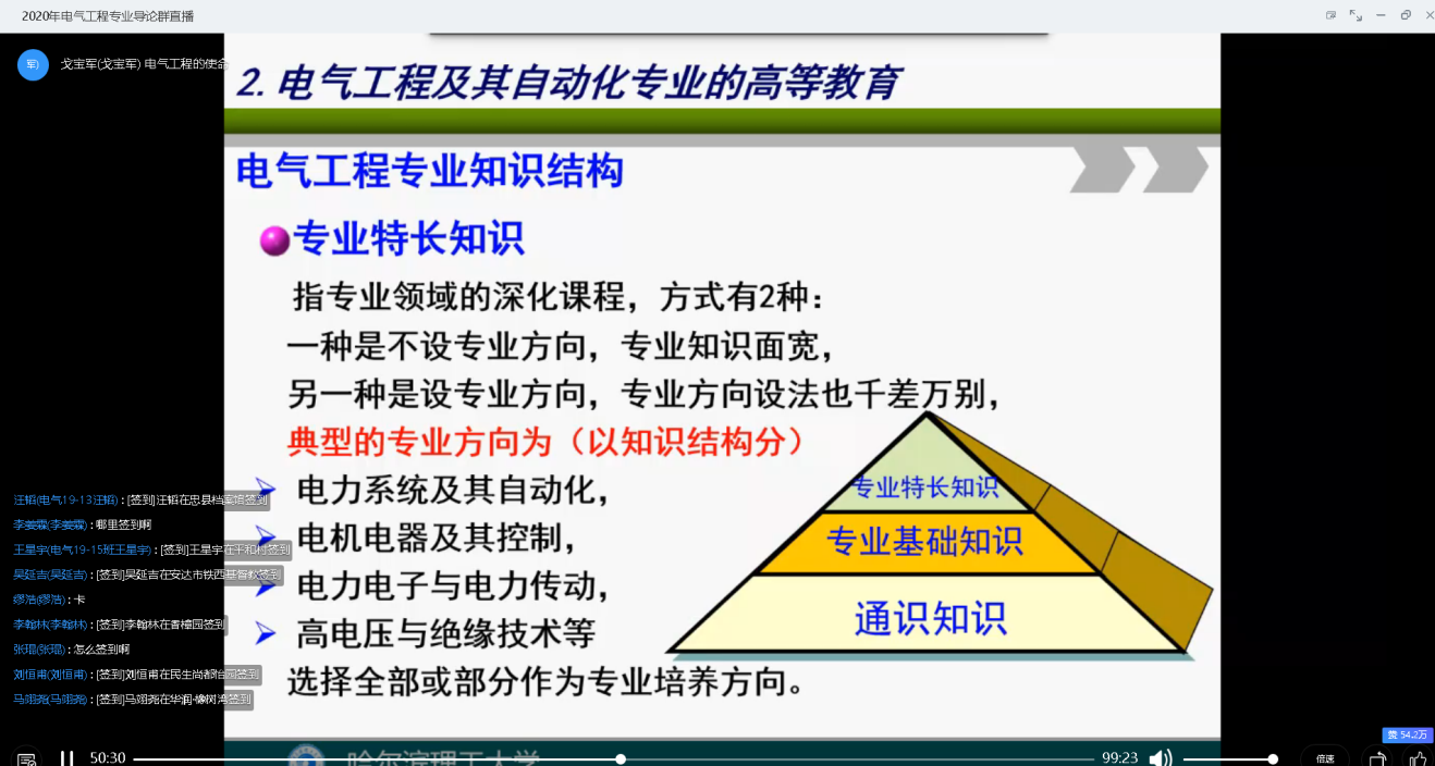 直播中戈宝军教授就目前学院的师资力量和专业实力进行了介绍。特别对电气专业的五个小方向,进行了分类讲解,让专业不再是学生熟悉的“名词”,而是具有功能性与社会意义的实际存在。让学生知道专业“学什么、怎么学”,也让学生知道专业知识“怎么用,用在哪”。他指出,我校在电气专业拥有强大的师资力量和平台建设,同学们一定要珍惜条件,刻苦钻研,千万不能枉费青春。
