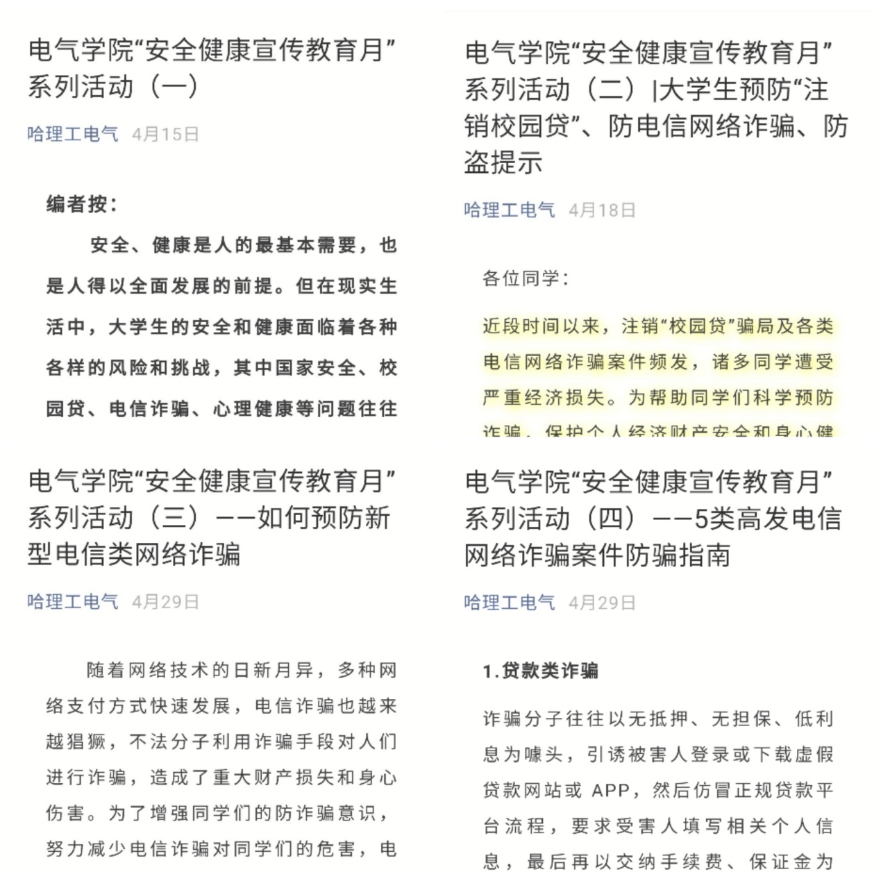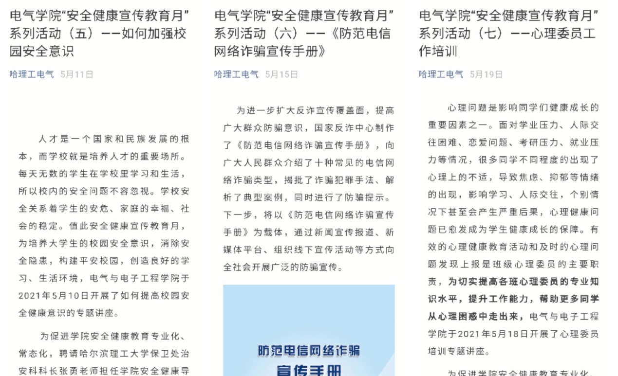 为更好的宣传安全健康知识,提升全体同学的安全健康意识,在“安全健康宣传教育月”期间,学院官方微信公众号“哈理工电气”共发表专题知识介绍和新闻报道7篇,为同学们获取相关知识提供了便捷的渠道。
