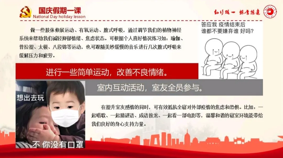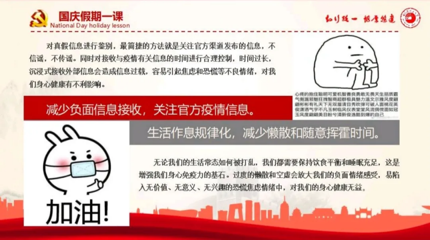 疫情期间关注身体健康的同时,更关注心理健康。保持良好的情绪、健康的躯体、正确的认知以及积极的行为是打赢这场疫情防控攻坚战强有力的武器。在今天这个信息化时代,我们要减少负面情绪接收,关注官方消息;同时进行一些运动,改善不良情绪。为保证疫情期间我校学生心态健康良好,在保密的前提下面向全体学生,开放线上心理咨询活动。保持稳定的情绪,积极的心态可以增强我们的免疫力,帮助我们抵御病毒。