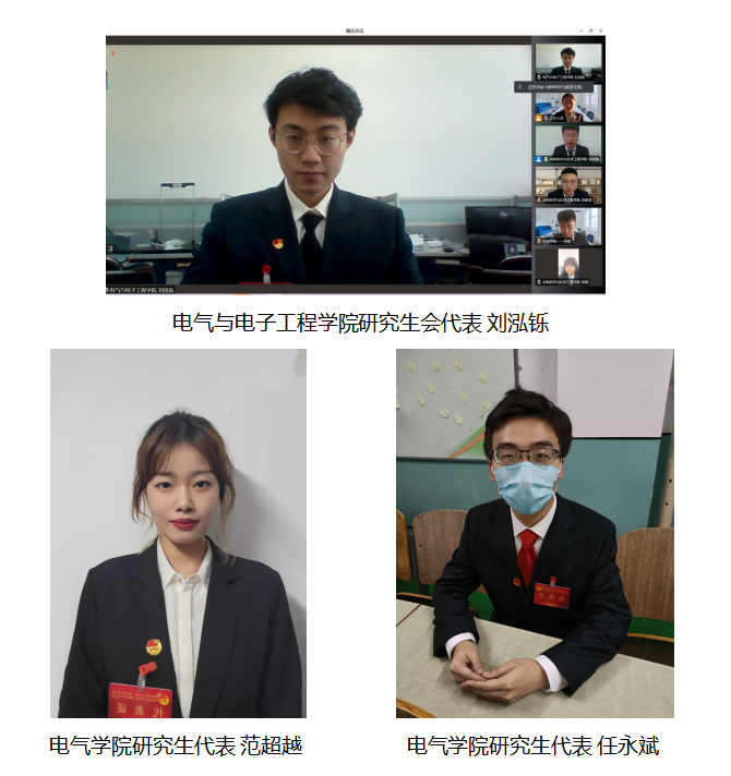 研代会正式代表刘泓铄(电气研20-4班):很荣幸能作为电气与电子工程学院研究生会代表参与本次研代会。在各代表团会议过程中,代表们各抒己见,充分讨论了在未来工作中将要面临的问题及解决方法,让我受益匪浅。自己将认真学习大会上做出的总结和经验,不断提升自己的能力,在未来的工作和学习中以饱满的精神和态度更好的为同学们服务。