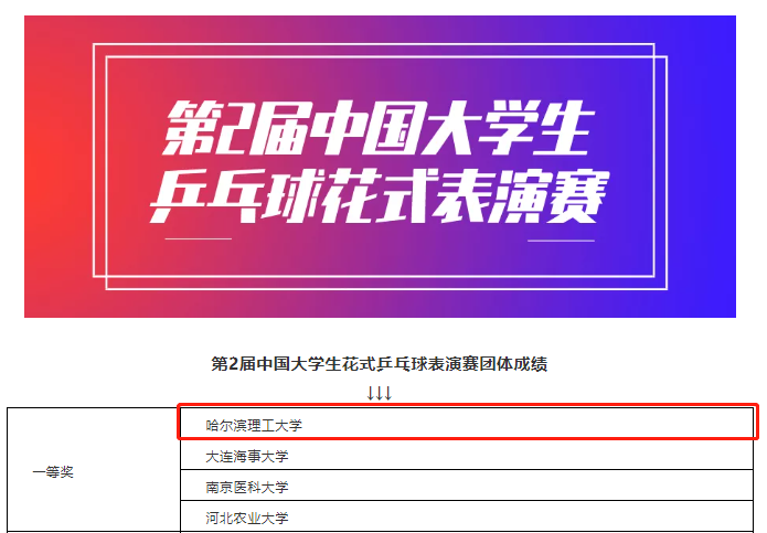 本次比赛由中国大学生体育协会主办、中国大学生体育协会乒乓球分会协办。根据疫情防控需要,比赛调整了往日传统的线下乒乓球比赛模式,于11月5日-11月23日通过线上评委初评以及视频复评进行评比与角逐。我院姚博洋同学以花式创新为主题,带来了与众不同、独具一格花式表演。他将个人球技与校园主题相融合,通过特殊的发球技巧将花式乒乓演绎成哈尔滨理工大学的简称“HUST”,借以表达对母校的爱戴,用自己的方式宣传母校、回馈母校、感恩母校。