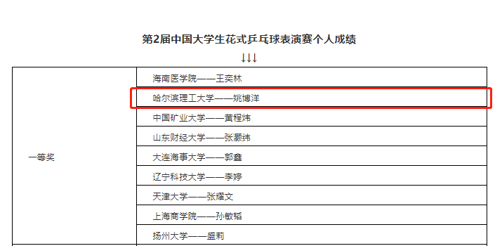 日前,第二届中国大学生乒乓球花式表演赛已正式圆满结束。哈尔滨理工大学电气与电子工程学院2020级研究生姚博洋代表哈尔滨理工大学参加团体赛、个人赛,并从全国35所高校的参赛者中脱颖而出,取得了第二届中国大学生花式乒乓球表演赛团体一等奖、个人一等奖的佳绩。