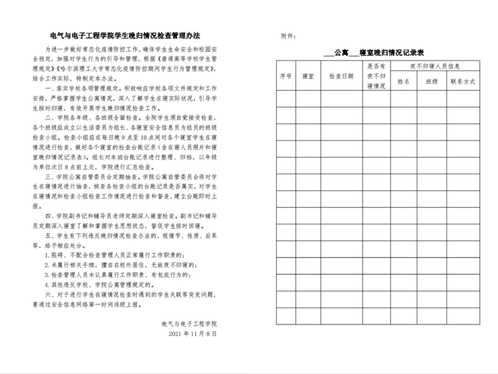 在总结上一学期学生公寓服务管理工作的基础上,结合本学期疫情防控要求要点,制定了《电气与电子工程学院学生公寓管理学期工作要点和计划》《电气与电子工程学院学生晚归情况检查管理办法》,并根据新生入学、日常管理、期末节假、放假离校等各阶段的特点,开展闭环管理工作,坚持做到:一是学院领导多次深入寝室检查公寓;二是学院辅导员积极开展日常寝室消防安全、内务卫生、晚归情况检查工作;三是公寓自管委员会学生骨干定期检查宿舍,进行A级、B级、C级评级评选,保质保量完成宿舍检查情况;四是寝室安全信息员每日点名打卡,做好台账记录,各年级台账整理有序、归档清晰,保证了疫情防控期间晚归检查的检查质量和效率。