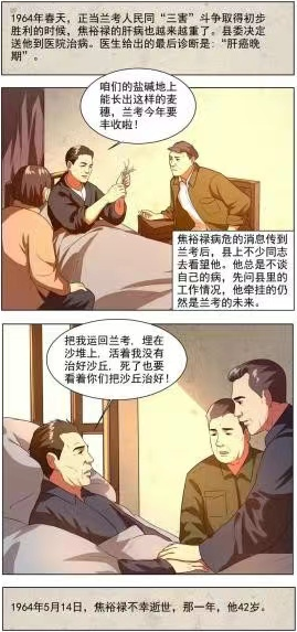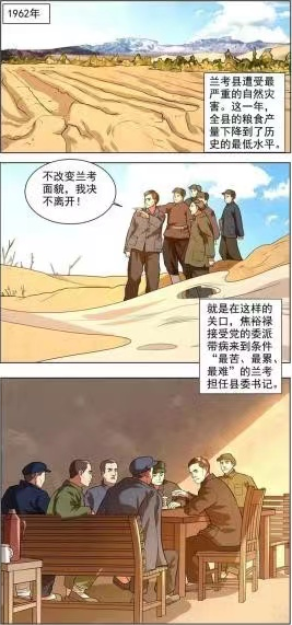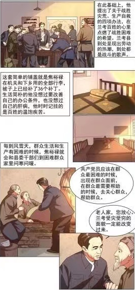 漫画《新中国史——焦裕禄事迹》讲述了兰考县在1962年遭受了最严重的自然灾害。这一年,全县粮食总产量下降到历史最低水平。而就是在这样的关口,焦裕禄却带病来到了条件恶劣、生活艰苦的兰考县担任县委书记。面对重灾,他向党组织表达了决心:“不改变兰考面貌,我决不离开!” 为改变该县面貌,他亲自带领全县人民向严重的自然灾害展开了顽强的斗争。虽然他当时已身患肝癌,但依旧忍着剧痛,坚持工作,被誉为“党的好干部”、“人民的好公仆”。他用自己的实际行动,铸就了亲民爱民、艰苦奋斗、科学求实、迎难而上、无私奉献的焦裕禄精神。