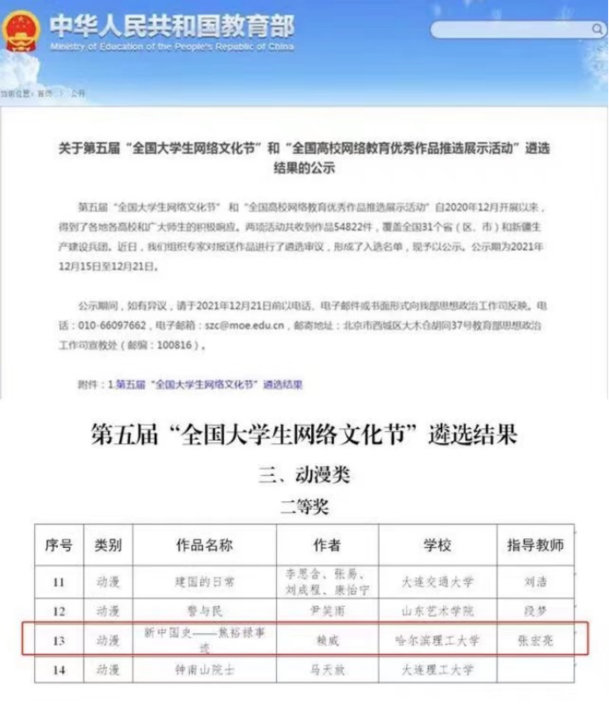 近日,第五届“全国大学生网络文化节”和“全国高校网络教育优秀作品推选展示活动”获奖名单在教育部网站公布。其中,由我院辅导员张宏亮老师指导的20级新能源1班赖威同学的作品《新中国史——焦裕禄事迹》荣获动漫类二等奖