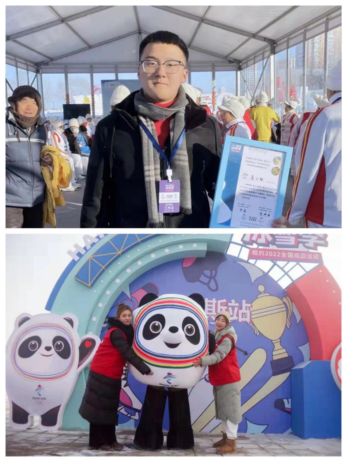 在本次以冬奥颁奖文化为主题、全民参与的活动中,马小琢同学参与了多项志愿服务工作:如现场舞台保障、冰场维护,扮演冬奥吉祥玩偶,进出口防疫检查等。为了更好地完成工作任务,马小琢同学积极学习冬奥会核心精神理念,提前搜集相关志愿者服务资料,确保了工作顺利开展。