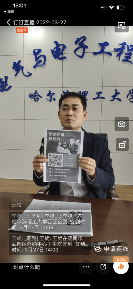 讲座结束后,周广老师首先代表同学们对张勇老师的精彩讲座表示感谢,再次强调疫情防控期间,同学们要严格遵守校规校纪,积极参加线上课程,体现新时代青年的勤学奋斗精神;杜绝私自外出等不当行为,体现新时代青年的综合素质;按要求报备行程、参加核酸检测,体现新时代青年的担当。最后向同学们介绍了“金钟罩”小程序、“哈理工电气”微信公众号、学校心理援助热线及心理咨询线上预约方式。本次安全主题讲座帮助同学们更好地了解新型诈骗手段,辨别诈骗信息,拒绝诈骗行为,缓解心理压力。(摄影:陈育杰)