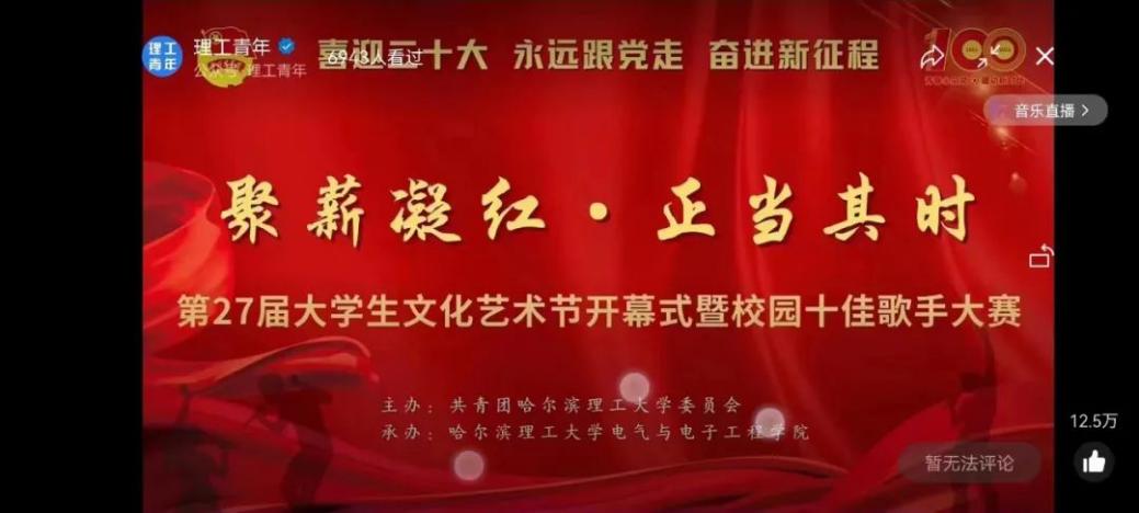 青春心向党,建功新时代。53日晚600,哈尔滨理工大学第27届大学生文化艺术节开幕式暨校园十佳歌手大赛决赛在西区1号楼0220报告厅举行。根据疫情防控要求,此次活动全程通过线上直播进行,全校师生7000余人次在线观看。直播间氛围欢快热烈,活动获赞12.5万。校党委宣传部副部长于海洋,建筑工程学院教师韩丽娜,校团委教师李晟睿,扬帆合唱团指导教师、电气学院学工办主任张宏亮,学校艺术团指导教师、外国语学院教师王梓懿担任本次比赛评委,为参赛选手线上评分。