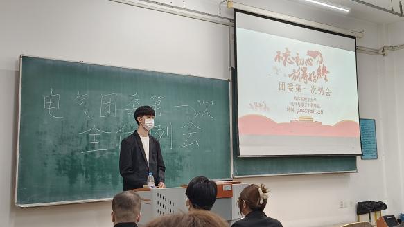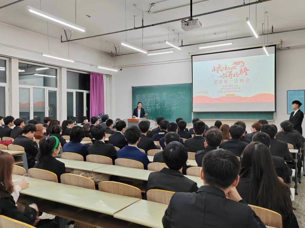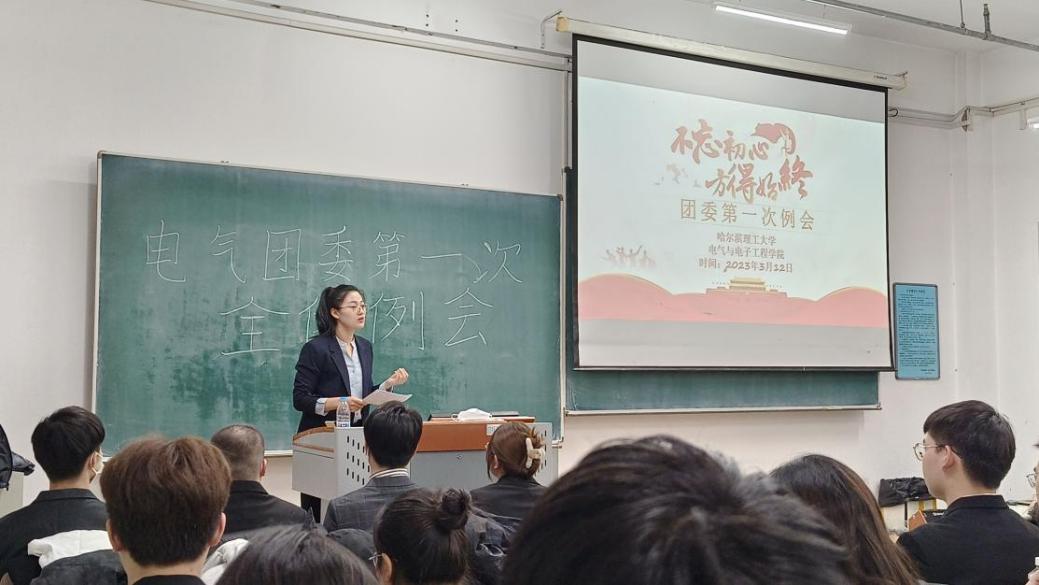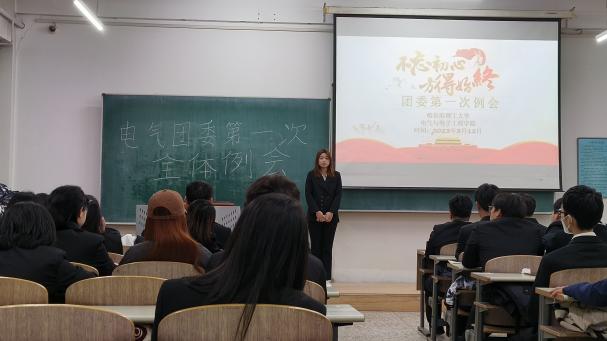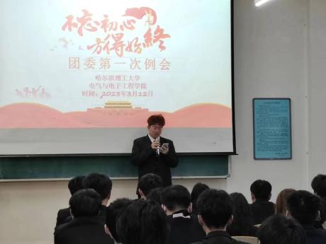 为有效开展新学期的各项工作,团结团委全体成员协调发展,提高工作能力和效率。2023年3月12日下午7点30点,哈尔滨理工大学电气与电子工程学院团委于新主楼H503召开了第一次全体例会。会议由团委常务团委副书记宋文鑫主持,秘书处做会议记录。电气学院团委书记张晶老师、各部门部长及全体部员参加本次例会。