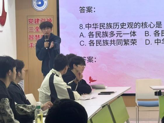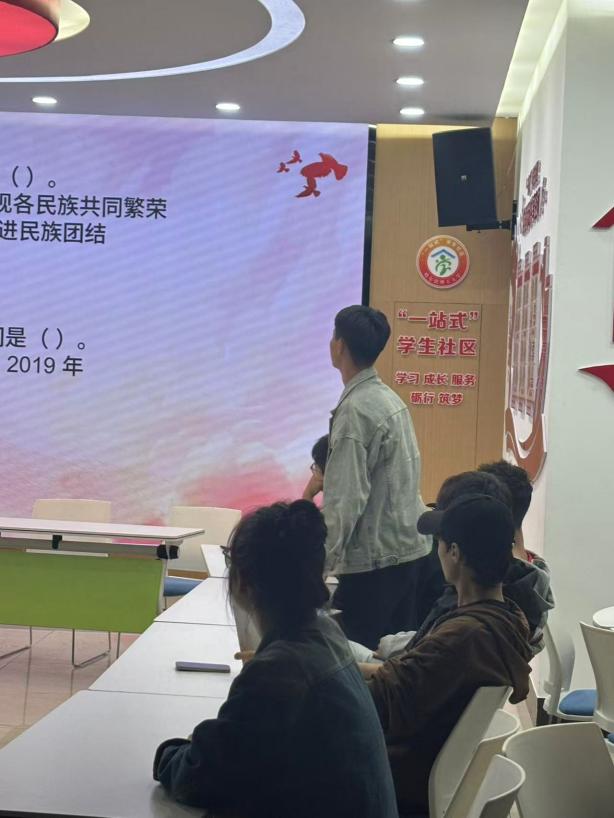 为兼顾知识性与趣味性,活动前期精心设计了涵盖民族文化习俗、民族政策法规、民族团结历史等多方面内容的选择题题库。随着主持人念出题目,现场立刻掀起抢答热潮:来自23级的蒙古族同学反应迅速,率先答对“我国56个民族中人口最多的少数民族是哪个”的问题;22级的回族同学则凭借扎实的知识储备,精准回答出多项民族政策相关题目。答题过程中,同学们时而为同伴的精彩作答鼓掌喝彩,时而为暂时的失误互相鼓励,在一问一答的互动中不仅拓宽了民族知识视野,更在彼此的默契配合中拉近了心灵距离,充分展现出各族学子勤学善思、团结协作的青春风貌。